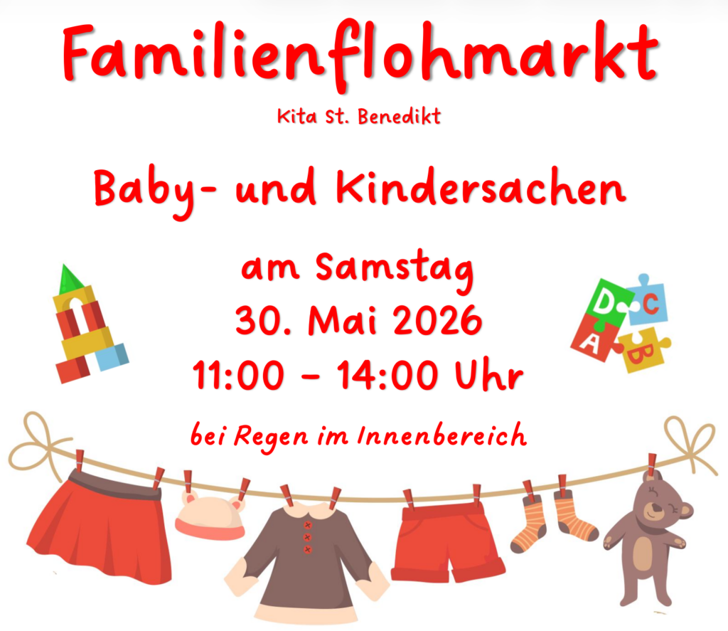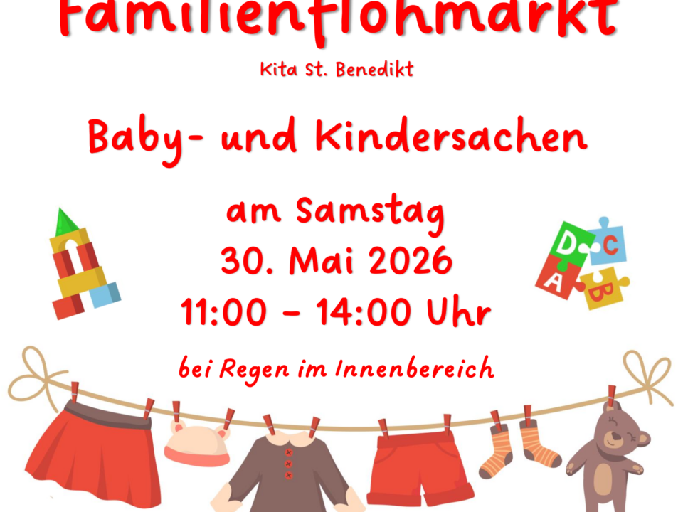 Am Samstag, dem 30. Mai, findet von 11:00 bis 14:00 Uhr der traditionelle Familienflohmarkt mit Baby- und Kindersachen auf dem Gelände der katholischen Gemeinde St. Benedikt statt.